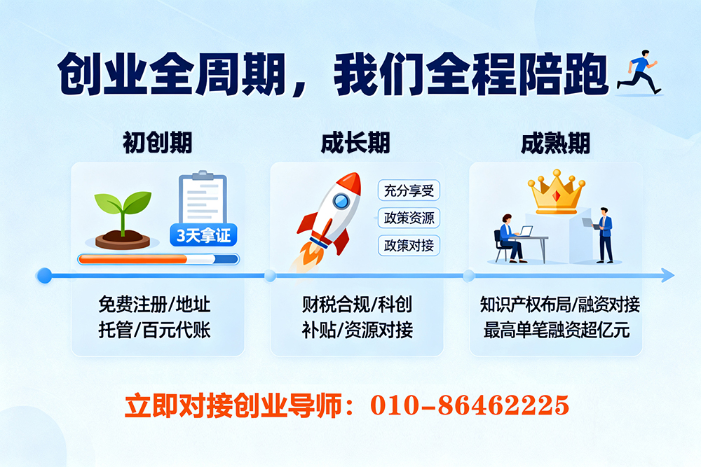 初创期·省心起步 免费公司注册(创始人亲带团队跑流程,这服务我们守了十年)、地址托管、公章刻制,3天内拿证;代理记账每月仅需百元,比请专职会计省80%成本。 | 成长期·精准赋能 资深导师一对一梳理财税问题,避免战略跑偏;政策专员精准对接北京科创补贴、税收减免,已帮企业申领超千万元红利;技术、市场资源直连,加速产品落地。 | 成熟期·资源破局 知识产权全流程布局(商标、专利、版权);搭建100+投资机构资源库,已助力100+企业完成首轮融资,最高单笔对接资金超亿元。 |