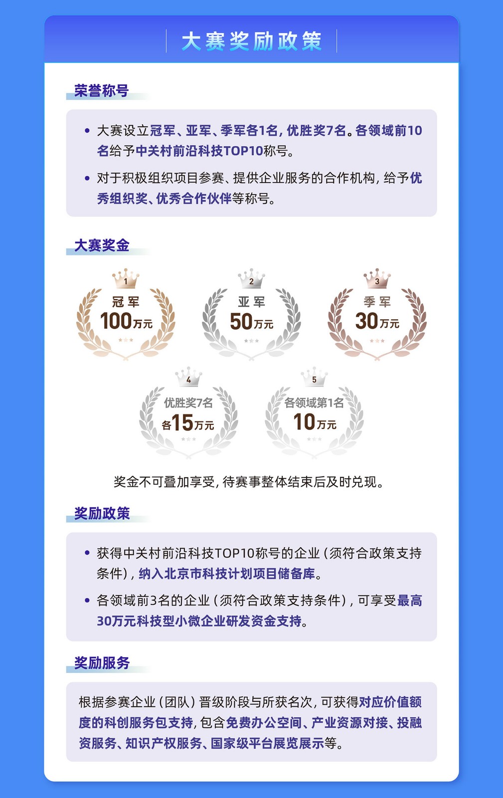 冠军100万元、亚军50万元、季军30万元,优胜奖15万元,各领域第1名10万元。奖金不可叠加享受,待赛事整体结束后及时兑现。