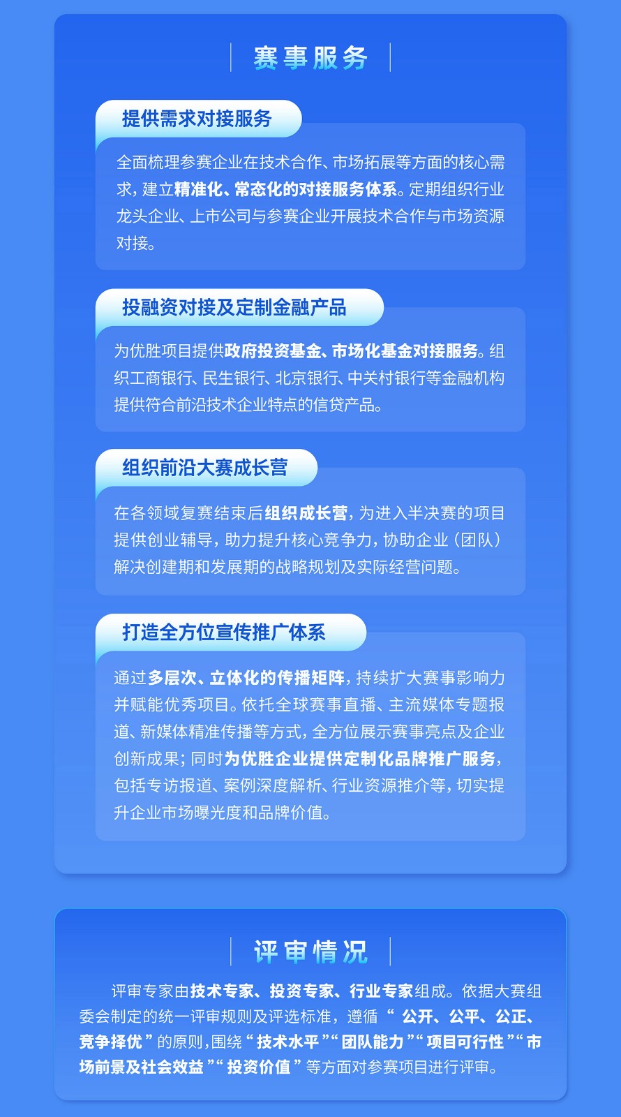 1.提供需求对接服务。全面梳理参赛企业在技术合作、市场拓展等方面的核心需求,建立精准化、常态化的对接服务体系。定期组织行业龙头企业、上市公司与参赛企业开展技术合作与市场资源对接。